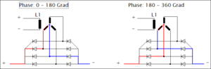 [[Bild: | [[Bild:LP Gleichrichter 01.png|miniatur|rechts|Stromlauf und Spannung für eine gleichgerichtete Spule]]Bild 6 zeigt dsas Prinzip eines Gleichrichters. Beispielhaft ist der Stromfluss (+ und -) sowie die Spannung (rot = positiv / blau = negativ) für eine Umdrehung (360°) für eine Spule dargestellt. | ||