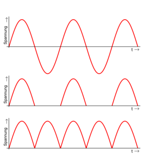 Bei der Gleichrichtung wird der Wechsestrom durch Dioden geschickt, die den Strom immer nur in eine Richtung fliessen lassen. Wenn man sich den Verlauf der Wechselspannung in Bild 3 (Oben), wird durch bei einer einfachen Gleichrichtung (eine Diode) praktisch die untere Kurve abgeschnitten, siege Bild 3 (Mitte). Die Polarität wechselt nun zwar nicht mehr, aber die Spannung steigt und sinkt immer noch zwischen Null und dem Spannungsmaximum und es fehlt immer die halbe Phase. Benutzt man 2 Dioden kann man die fehlende halbe Phase noch dazu gewinnen, bildlich gesprochen, wird die halbe Sinuskurve nach oben geklappt, wie man in Bild 3 (Unten) sieht. Jetzt gibt es zwar nur noch die positiven Spannungsanteile (d.h. der Strom fliesst nur noch in eine Richtung) aber er steigt und sinkt immer noch alle 90°.