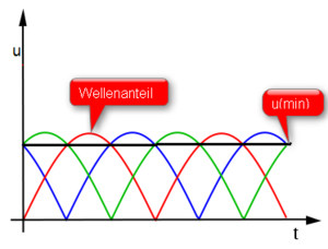 Um diesen Verlauf weiter zu glätten und einen möglichst gleichmässigen Gleichstrom zu erhalten, werden in dem Wechselstromgenerator des Fahrzeugs nun drei Spulen verwendet, die mit 120° Versatz angeordnet sind. Daraus resultieren drei um 120° versetzte Wechselspannungen, wie sie in Bild 4 zu sehen sind. Diese werden dann gleichgerichtet, d.h. alle negativen Spannungen werden, wieder bildlich gesprochenm nach oben geklappt, siehe Bild 5. Es ist zu erkennen, dass durch die Verwendung von dreo gleichgerichteten Phasen eine wesentlich gleichmässigere Spannung als mit nur einer Spule entsteht (Vergleich: Bild 3, unten).