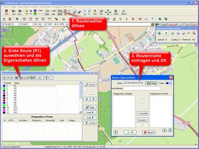 Um eine Route anzulegen, den Routeneditor öffnen, den ersten Routenplatz (R1) anwählen, die EIgenschaften öffnen und der Route einen Namen geben.