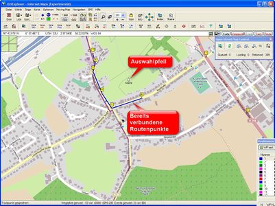 Sind die Wegpunkte gesetzt verbinden wir sie zu einer Route. Dazu zurück zum ersten Wegpunkt und im Routeneditor auf "WP einf." klicken. Nun nacheinander mit dem