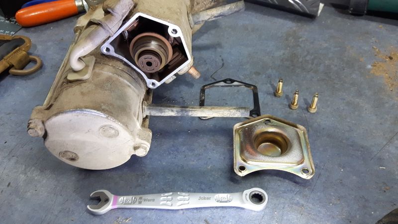 Der elektromagnetische Einrückmechanismus mit der Schaltplatte für den Anlassermotor.