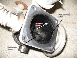 Die Motorsteuerung (ECU) misst den Frischluftstrom (Ansaugluft) mittels des Luftmassensensors, die Motorlast und die Umgebungstemperatur um das EGR Magnetvetil anzusteuern. Dieses Magnetventil ist einerseits mit der Unterdruckpumpe verbunden, andererseits mit dem Membranventil und der Frischluftdrosselklappe (dünner blauer Schlauch). Beides befindet sich auf bzw. in einem Rohrstück, welches direkt vor dem Ansaugkrümmer sitzt und durch das gekühlte Frischluft zum Zylinder strömt.