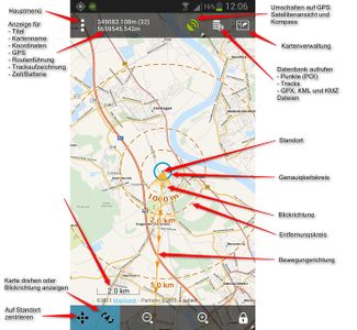 Diese Android Anwendung für Mobiltelefone und Tablets bietet einen sehr hohen Funktionsumfang und viele Online-Kartenquellen (Internetverbindung erforderlich), von denen etliche auch offline (ohne Internetverbindung) verwendet werden können. Die Hauptfunktionen sind Navigation, Routentracking und Geocaching.